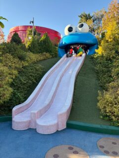 このように楽に楽しめるように準備をしていきましたが、娘が一番楽しんでいたのは、クッキーモンスターの大きな滑り台で、特に待たずに乗れるものでした・・・。